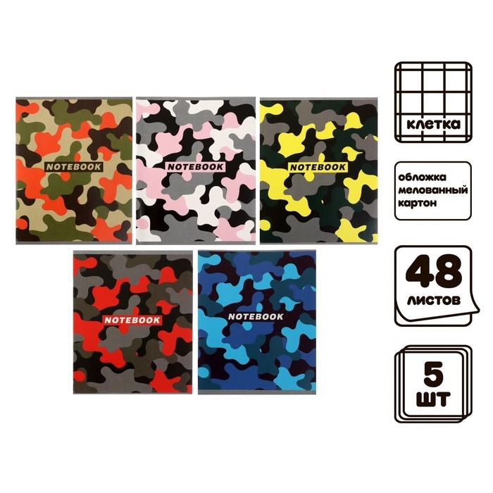 Комплект тетрадей из 5 штук, 48 листов в клетку Calligrata "Цветной камуфляж", обложка мелованный картон, блок офсет
