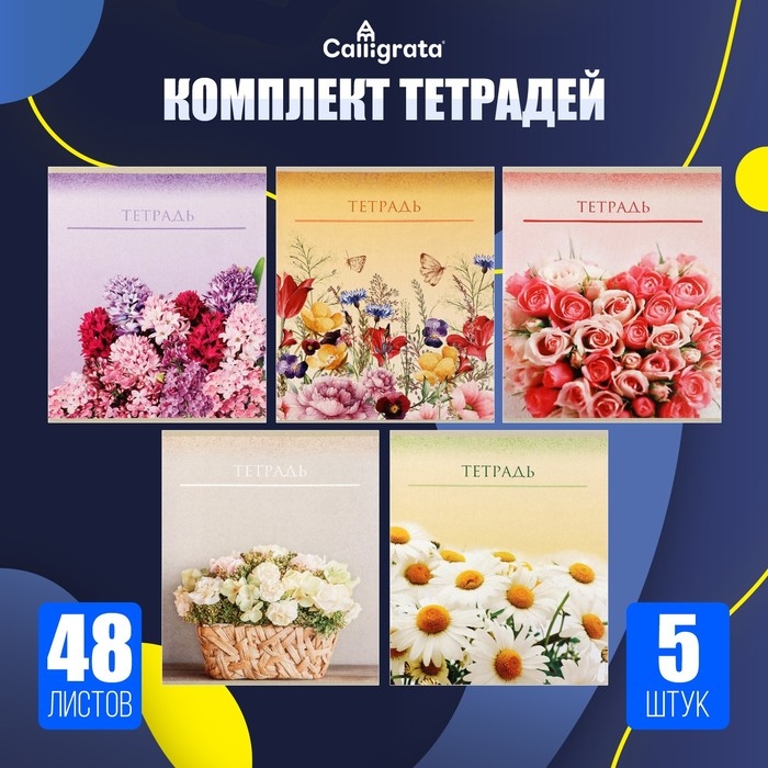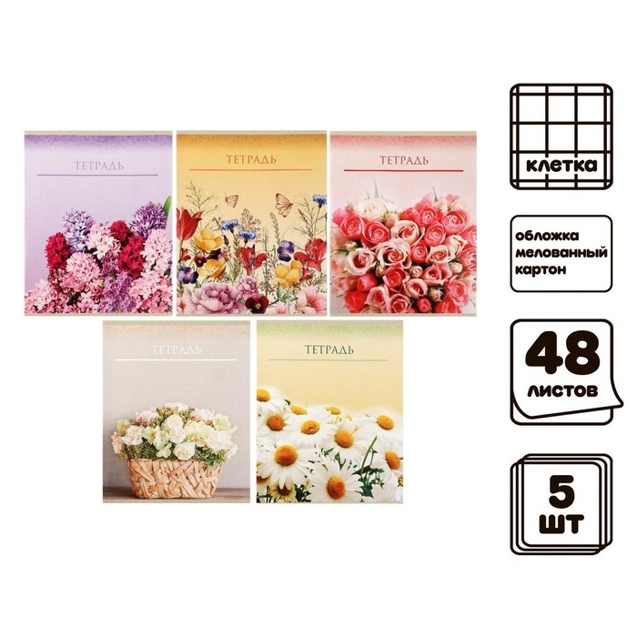 Комплект тетрадей из 5 штук, 48 листов в клетку Calligrata "Цветы", обложка мелованный картон, блок офсет