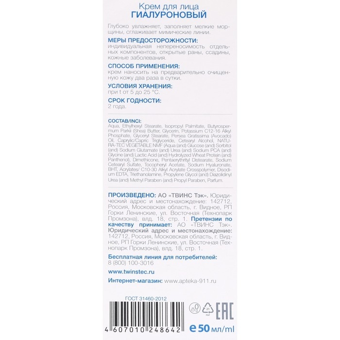 Крем гиалуроновый увлажняющий подходит для лица, шеи, зоны вокруг глаз.