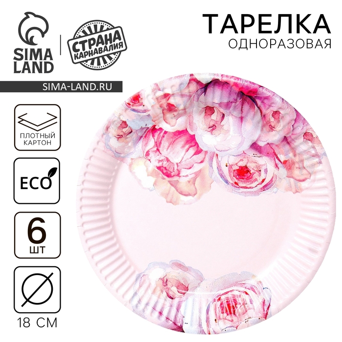 Тарелка одноразовая бумажная Пионы, набор 6 шт, 18 см