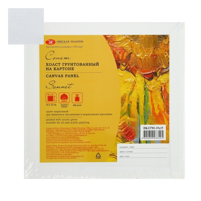 Холст на картоне хлопок 100% ЗХК "Сонет", 15 х 15 см, 3 мм, акриловый грунт, мелкое зерно