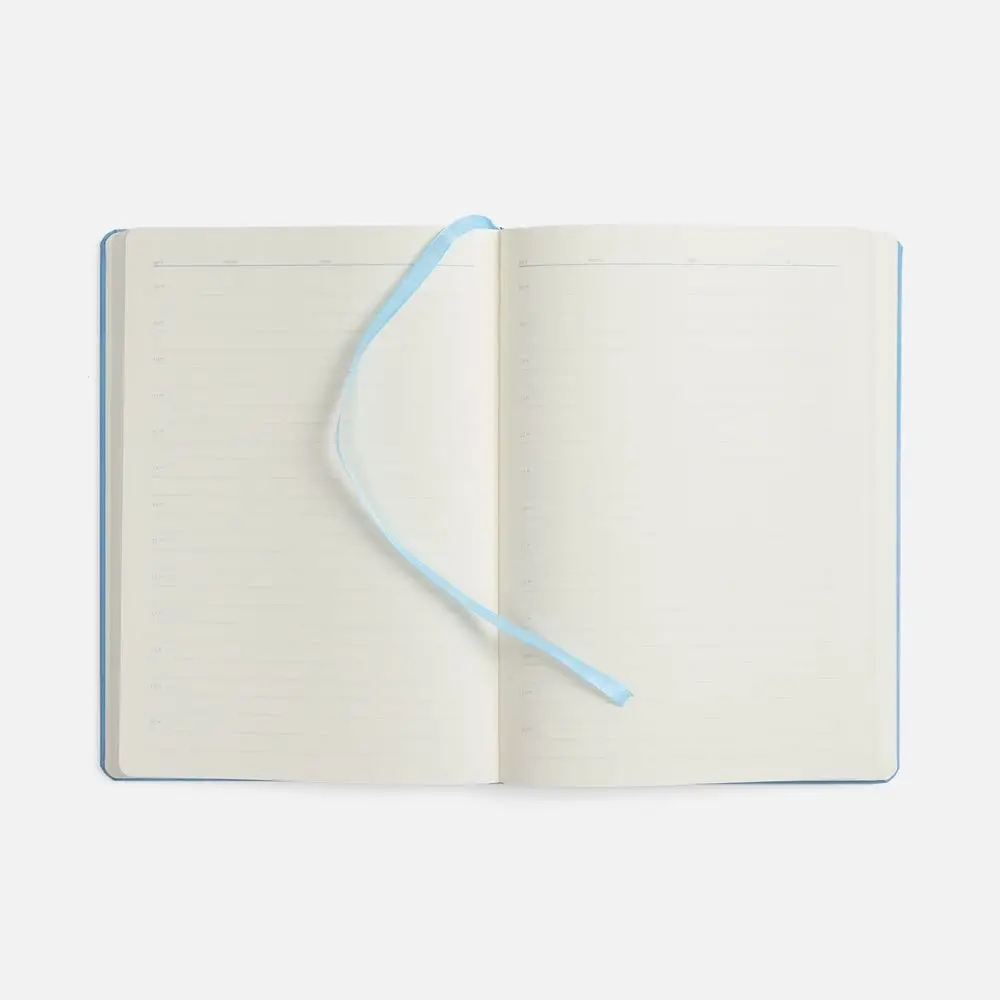 Ежедневник с твердой обложкой, выполнен из материала Nubuck Touch, голубой JJ, дополнен ляссе светло-голубого цвета.