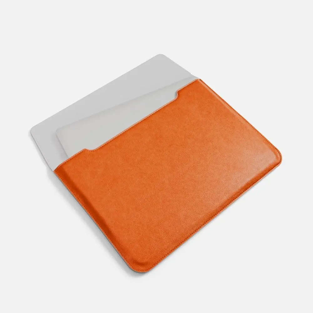 Чехол для ноутбука с диагональю до 15,6 выполнен из материала Petrus, оранжевого цвета, дополнен окрашенным срезом края серого цвета.