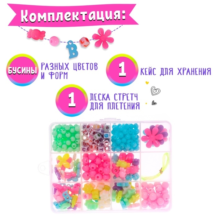 - С помощью набора можно сплести браслеты, ожерелья и другие аксессуары. Эластичная леска упрощает процесс работы, делая его доступным даже для начинающих.