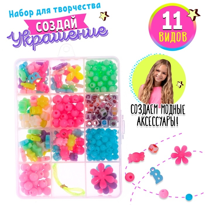 Набор для создания украшений из бисера идеально подходит для тех, кто хочет развивать свои творческие способности и мастерить стильные аксессуары. Этот комплект включает в себя 11 видов бусинок, различных по форме и цвету, что позволяет воплощать в жизнь самые разные идеи и создавать уникальные украшения.