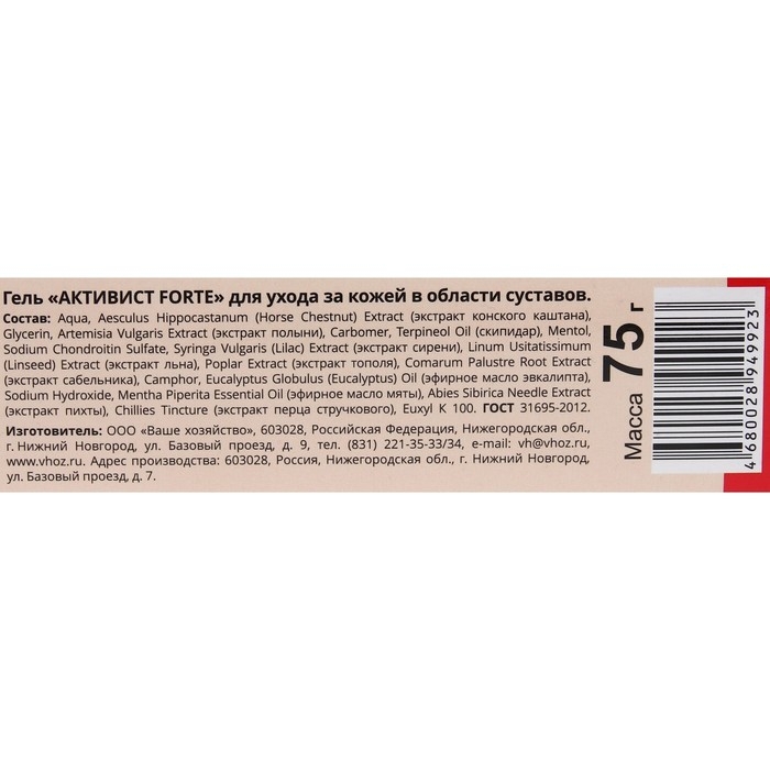 Гель «Активист» содержит уникальный фитокомплекс. Экстракт конского каштана улучшает эластичность сосудов, ускоряет рассасывание гематом и отеков. Экстракты полыни и пихты оказывают бактерицидное, противовоспалительное, успокаивающее действие. Экстракт красного перца введен в гель в качестве разогревающего и болеутоляющего средства. Камфора также оказывает разогревающее, болеутоляющее и антисептическое действие.