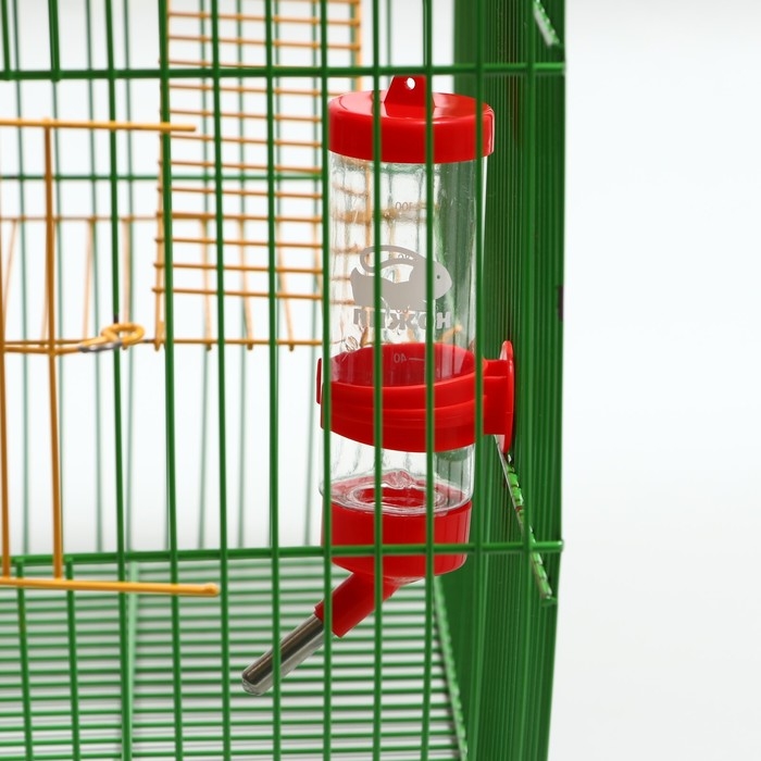 Поилка крепится между прутьев клетки, оснащена носиком из нержавеющей стали с металлическим шариком, который препятствует вытеканию воды.