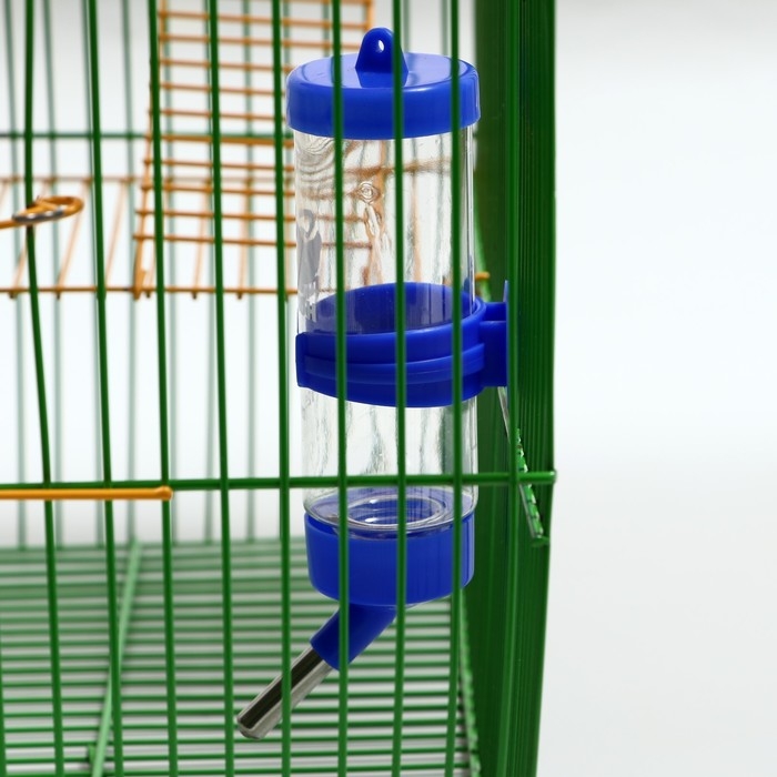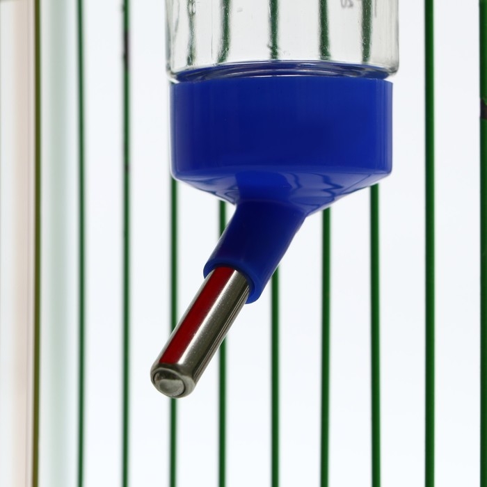 Поилка крепится между прутьев клетки, оснащена носиком из нержавеющей стали с металлическим шариком, который препятствует вытеканию воды.