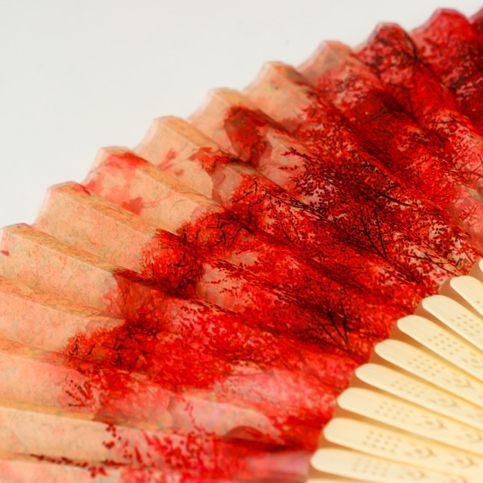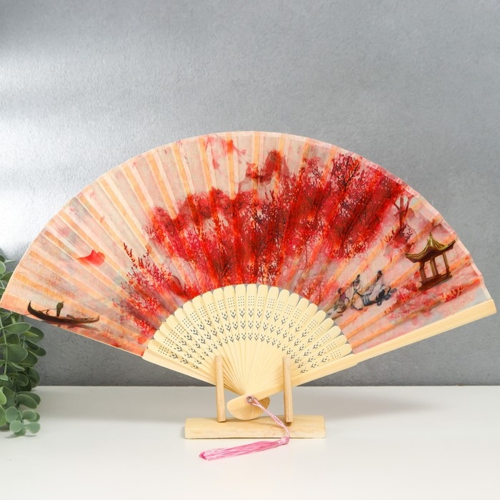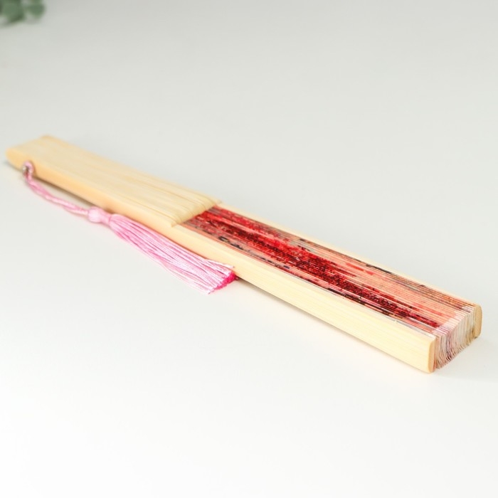 Веер бамбук, текстиль h=23 см "Вечер на реке" красный, с кисточкой