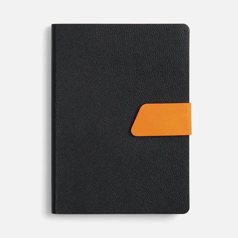 Ежедневник с гибкой обложкой, выполнен из материала La Fite, черный АА и Nubuck Touch, оранжевый, дополнен оранжевым ляссе и хлястиком на кнопке.