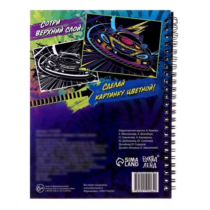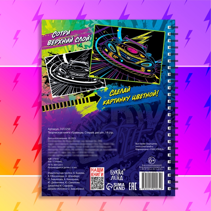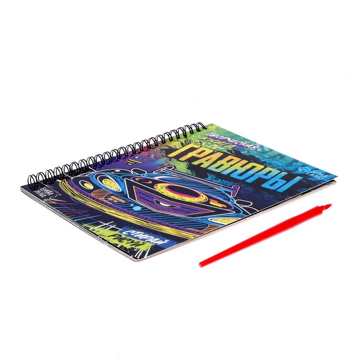 Чтобы сделать гравюру, нужно просто стирать верхний слой с помощью пластикового штихеля, который входит в набор. В книге вы найдёте 10 гравюр и интересные задания «найди и покажи».