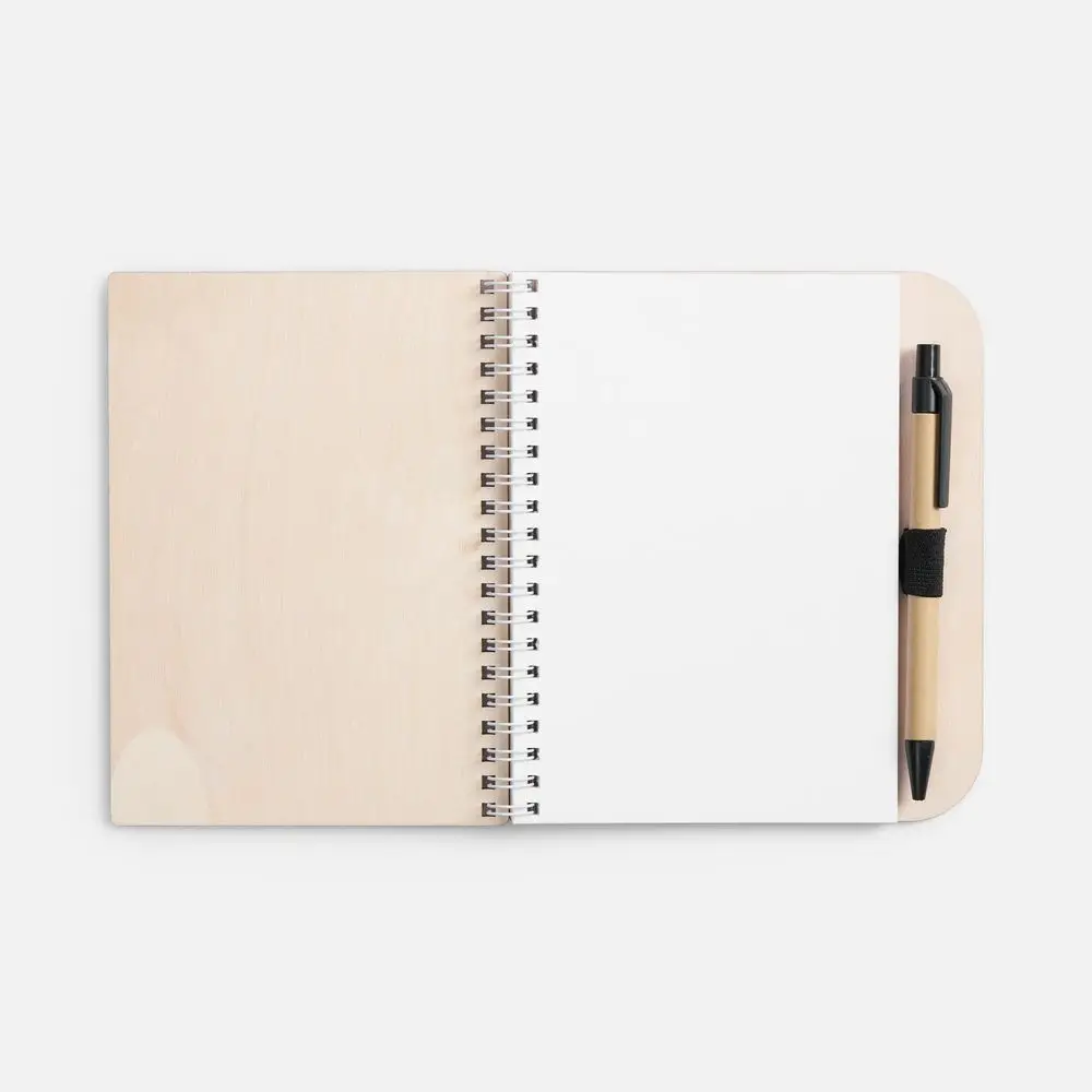 Блокнот на пружине Woodpad с деревянной обложкой. Входящая в комплект ручка крепится к нижней обложке резинкой.