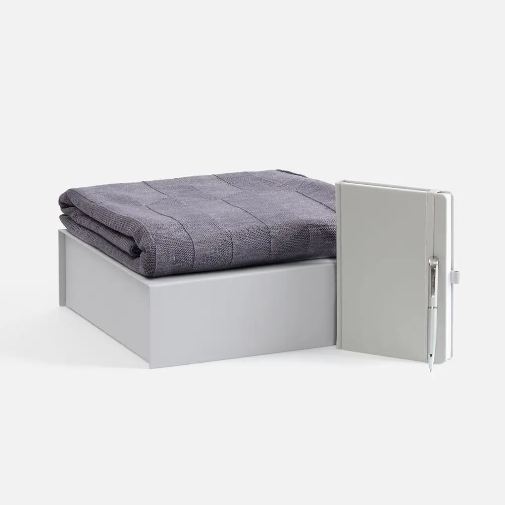 Однотонный набор с основной канцелярией и пледом — классика жанра в уютном исполнении. С компактным ежедневинком будет удобно делать заметки в любое время — благодаря петельке для ручки любимый пишущий инструмент будет всегда под рукой. А изысканный акриловый плед с геометрическим узором позволит выразить самые теплые пожелания и ддобавит плавных линий в интерьер.