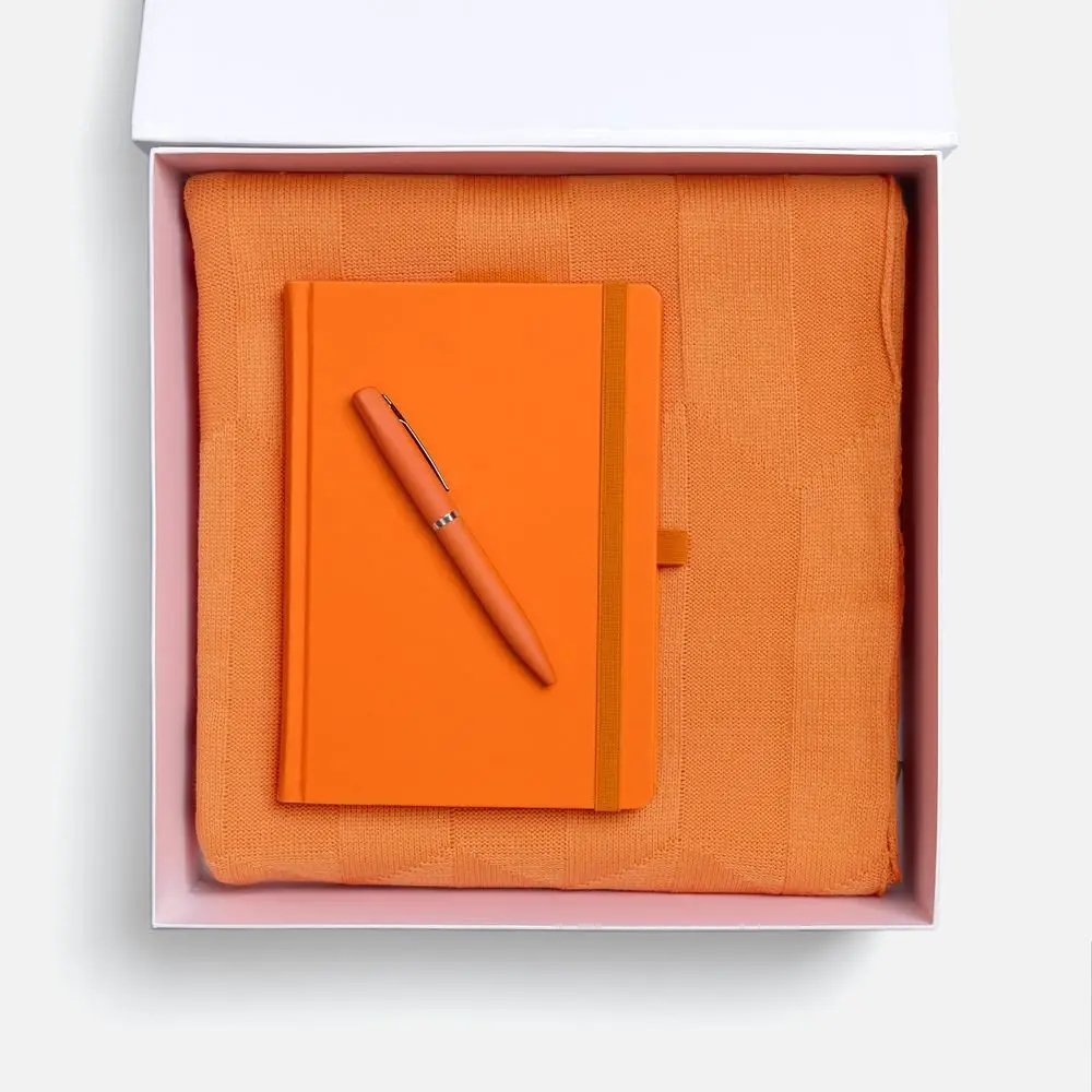 Однотонный набор с основной канцелярией и пледом — классика жанра в уютном исполнении. С компактным ежедневинком будет удобно делать заметки в любое время — благодаря петельке для ручки любимый пишущий инструмент будет всегда под рукой. А изысканный акриловый плед с геометрическим узором позволит выразить самые теплые пожелания и ддобавит плавных линий в интерьер.