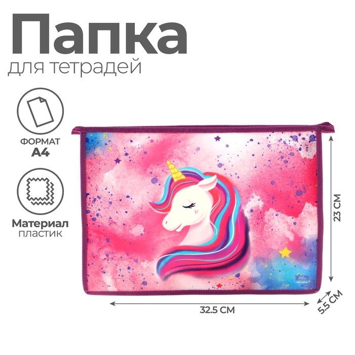 Папка для тетрадей А4, 325 х 230 х 55 мм, молния сверху, пластиковая, ПМ-А4-29 Calligrata "Единорог"