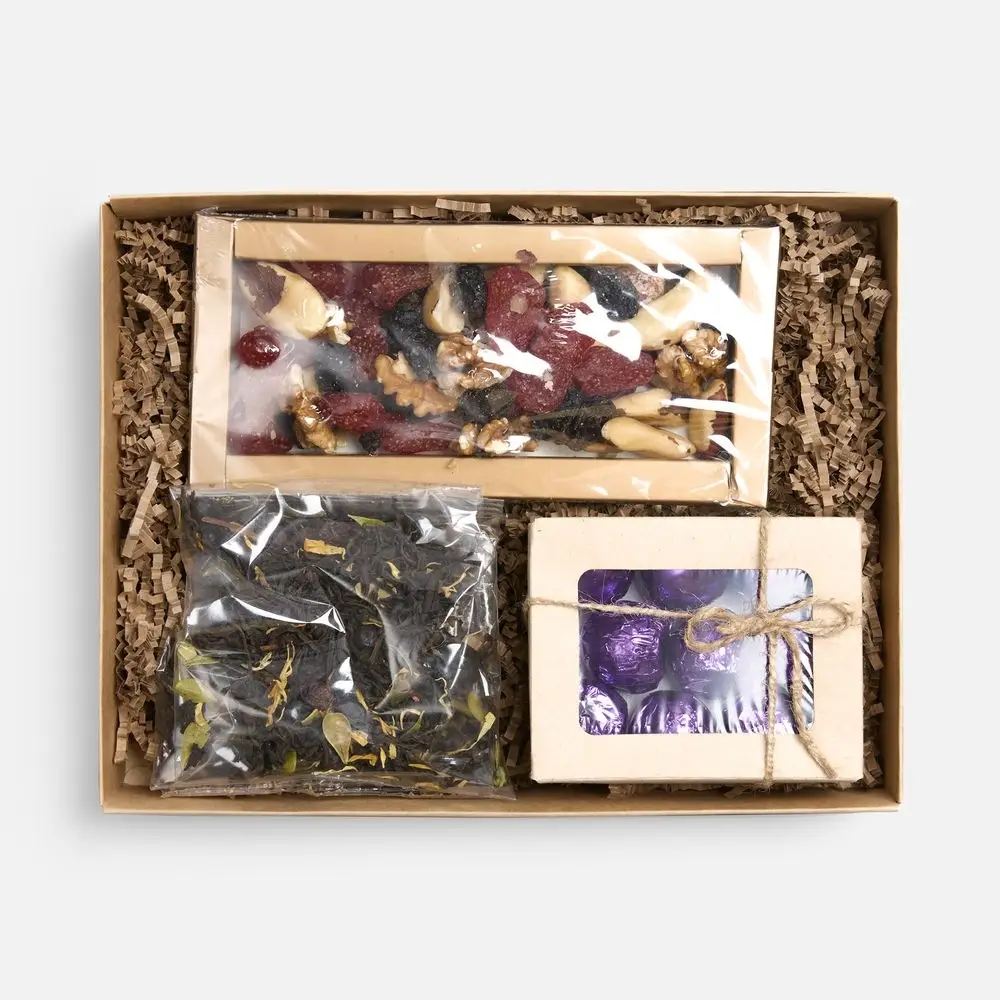 Иногда для счастья нужно совсем немного: тепло близких людей рядом и кружка теплого любимого напитка в руках для сладкого перерыва. Набор Quality Time создан именно для таких уютных моментов: чтобы время определенно было проведено с пользой, достаточно на домашние посиделки захватить с собой комплект из ароматного чая, полезной орехово-цукатной смеси и благородного грильяжа.