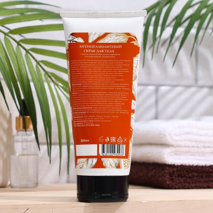 Скраб для тела Anti-Cellulite Chocolate Program Body Scrub станет вашим любимым средством на ванной полке. В нём нашли сочетание важнейшие виды воздействия на проблемные зоны, а именно массаж, очищение, увлажнение и тонизирование. Скраб мягко удаляет омертвевшие клетки кожи, массирует, стимулирует микроциркуляцию крови. Масло какао бобов повышает эластичность кожи, обеспечивает лифтинг - эффект, укрепляет стенки сосудов. Экстракт ламинарии оказывает антиоксидантное действие и выводит токсины. Кожа становится нежной и упругой, без намека на целлюлит. А соблазнительный аромат шоколада расслабляет и успокаивает, создавая атмосферу особой роскоши и благополучия.