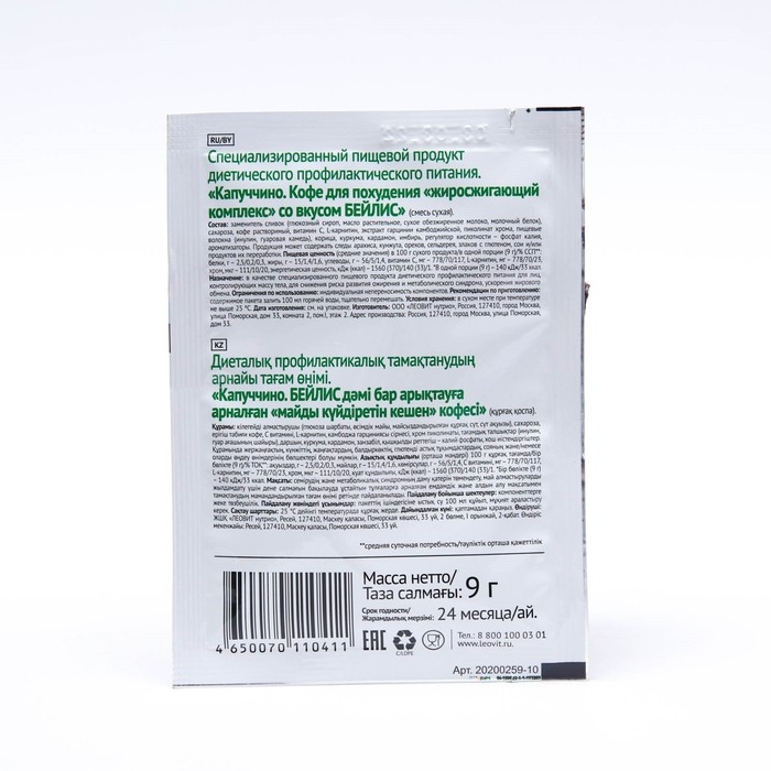 Кофе для похудения Леовит "Капучино", бейлис, 9 г