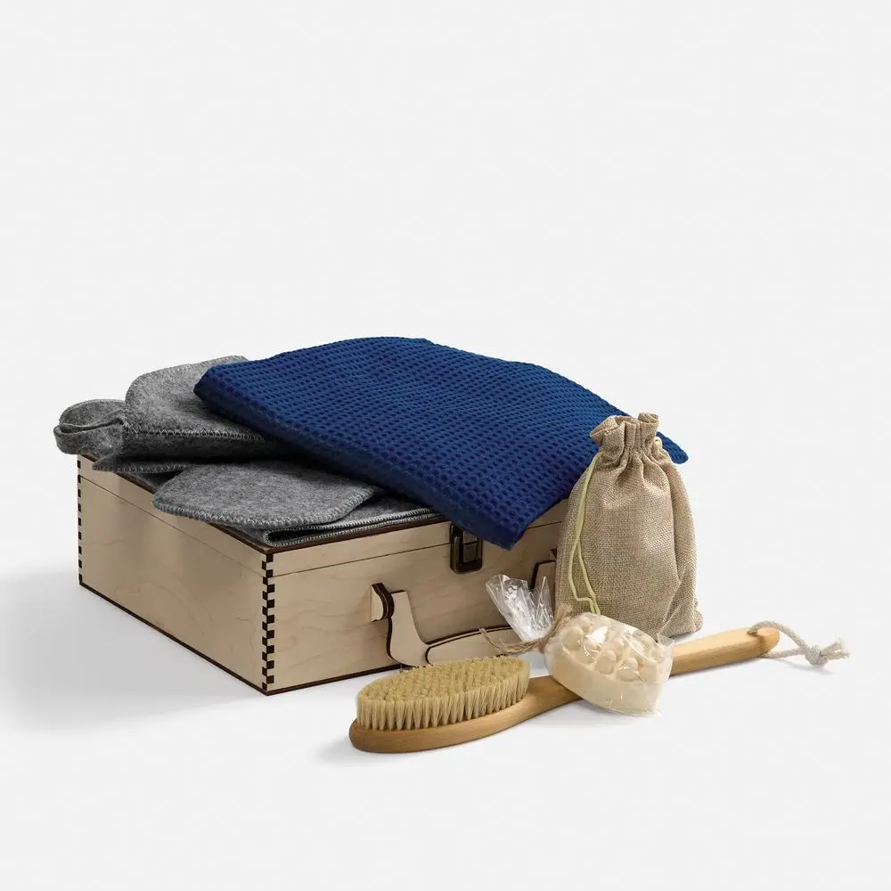 кейс - дерево, береза; банная шапка, коврик, рукавица - шерсть, 40%, полиэфир 60%; войлок; килт - хлопок 100%, плотность 240 г/м²; щетка - дерево, карельская береза; щетина кабана средней жесткости