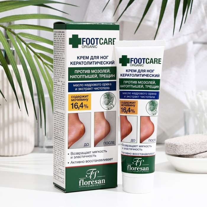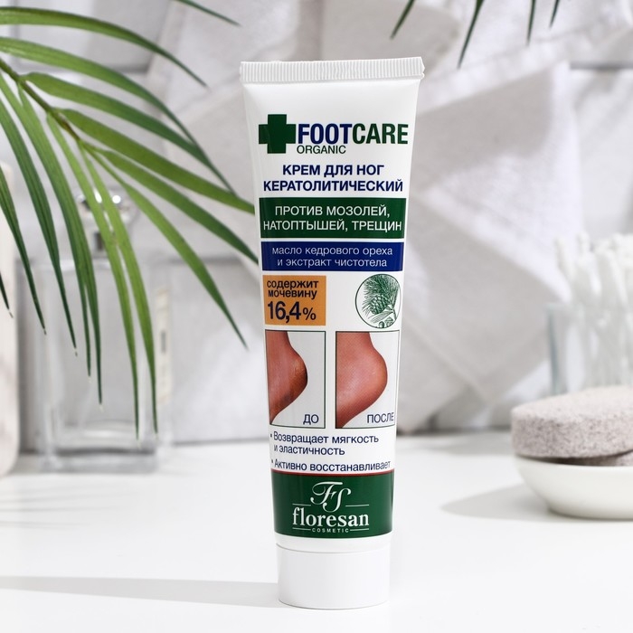 Кератолитический крем для ног Floresan с экстрактом чистотела и маслом кедрового ореха - эффективное средство для борьбы с натоптышами, трещинами, сухими мозолями и огрубевшими участками кожи стоп.
