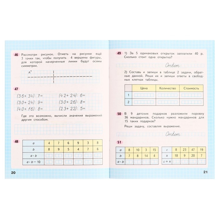 Тетради по математике (части 1 и 2) предназначены для учащихся общеобразовательных организаций. Они призваны помочь учителю в организации самостоятельной работы учащихся в 3 классе как на уроке (с отдельными учениками, группой учеников или со всем классом), так и дома.Материал тетрадей расположен в соответствии с логикой изложения курса в учебнике «Математика. 3 класс. Части 1 и 2» авторов М. И. Моро, М. А. Байтовой, Г. В. Бельтюковой, С. И. Волковой, С. В. Степановой: задания подобраны по каждой теме, представленной в учебнике. В тетрадях наряду с разнообразными тренировочными заданиями представлены и нестандартные упражнения, вызывающие интерес у детей и способствующие развитию у них наблюдательности, памяти, воображения, логического мышления.