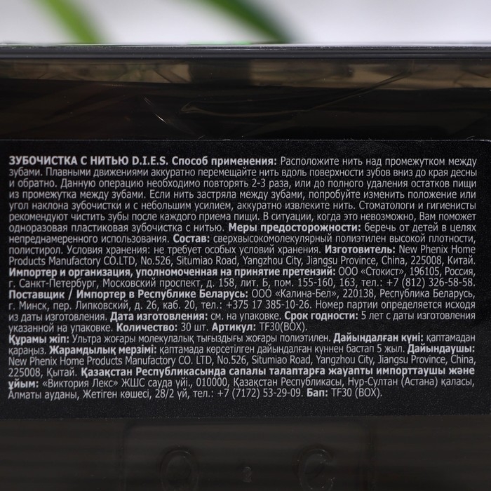 Описание: зубочистка с нитью D.I.E.S. с освежающим ароматом мяты - это самое легкое, удобное и эффективное средство для гигиены полости рта. Зубочистка с нитью легко проникает в труднодоступные промежутки между зубами и удаляет остатки пищи и зубной налет. Использование зубочистки с нитью D.I.E.S. после каждого приема пищи предотвращает образование кариеса, снижает риск возникновения заболеваний десен и появление неприятного запаха изо рта. Такую зубочистку легко можно использовать в любом месте: в офисе, в ресторане, в кафе. Имеет две рабочие зоны - острый изогнутый кончик, который можно использовать как обычную зубочистку и дужку с нитью.