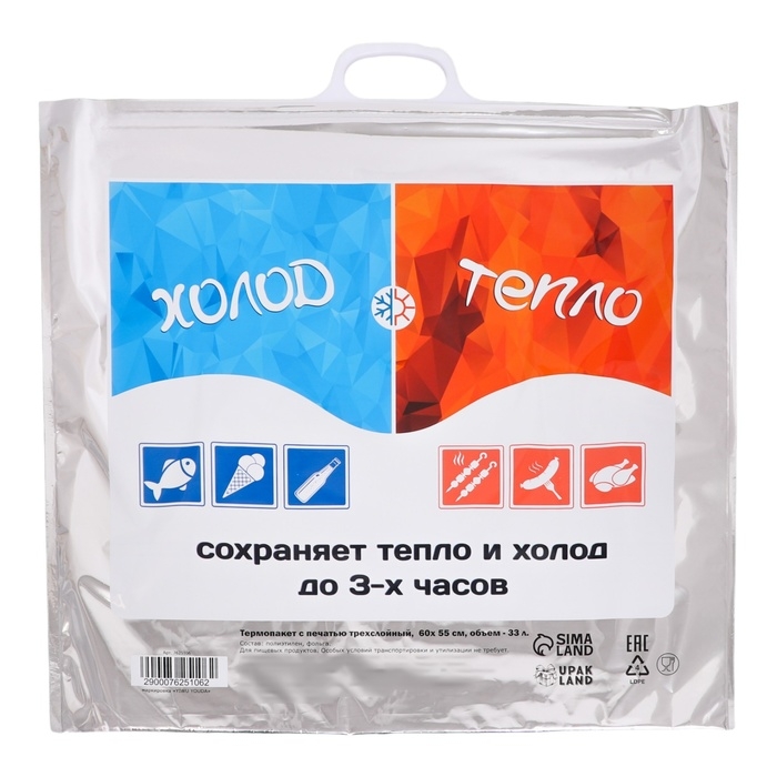 Термопакет – это упаковка, в которой можно хранить и транспортировать замороженные, охлажденные или горячие продукты без потери их первоначального состояния. Почти невесомый многоразовый пакет - термос с ручками вмещает до 33 литров содержимого и сохраняет его начальную температуру неизменной в течение нескольких часов. Термопакет невозможно разбить и он отлично стирается.