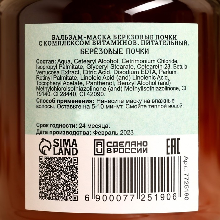 Бальзам-маска «Берёзовые почки» с комплексом витаминов уменьшает выделение кожного сала, придаёт блеск, устраняет перхоть, укрепляет волосы, останавливает их выпадение. Придаёт блеск и ухоженный вид волосам, питает клетки кожи головы, активно восстанавливает структуру волос. Не рекомендуется регулярное применение при сухих и тонких волосах.
