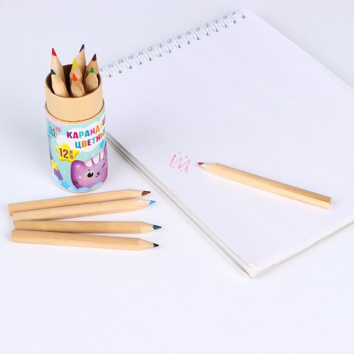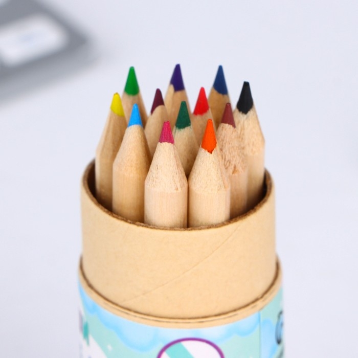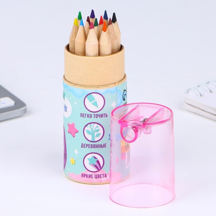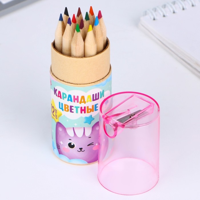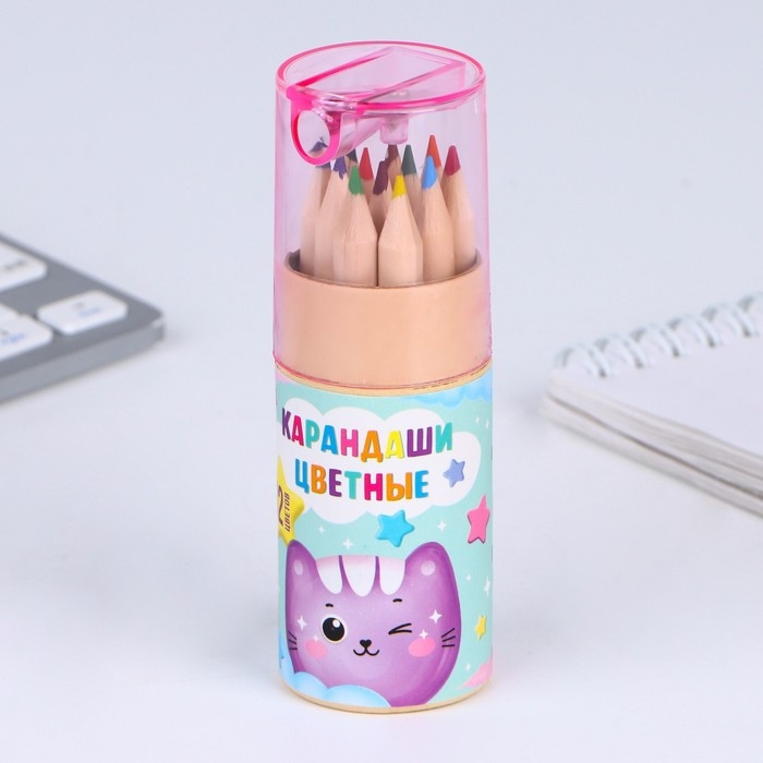 Набор цветных карандашей мини в тубусе «Котик», 12 шт, с точилкой