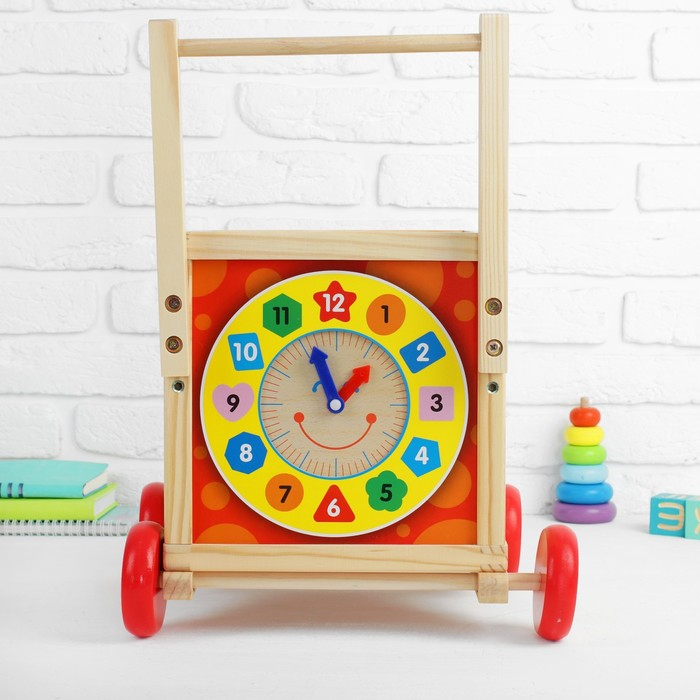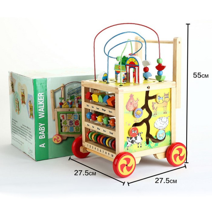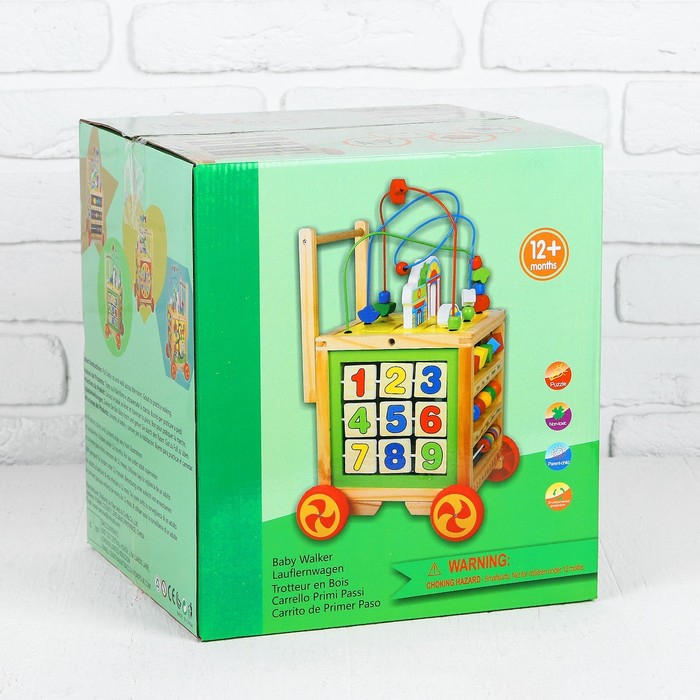 В логическом центре вы найдёте 5 игровых поверхностей с разными модулями. Есть лабиринт, кубики с цифрами, серпантинка, часики, бусины разных цветов. Отличительной чертой является формат каталки: благодаря колёсам и ручке кроха сможет перемещать игрушку и сам тренироваться в ходьбе. Логический центр развивает память, моторику пальчиков, логику, расширяет кругозор. Сделан из дерева, окрашен безопасными лаками.