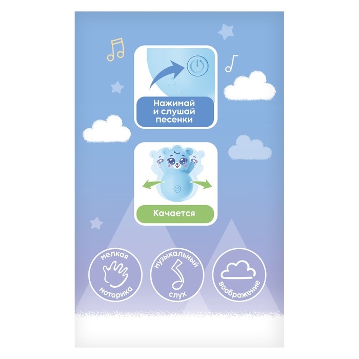 - Чтобы неваляшка запела, нажмите на кнопочку на животике зверька.