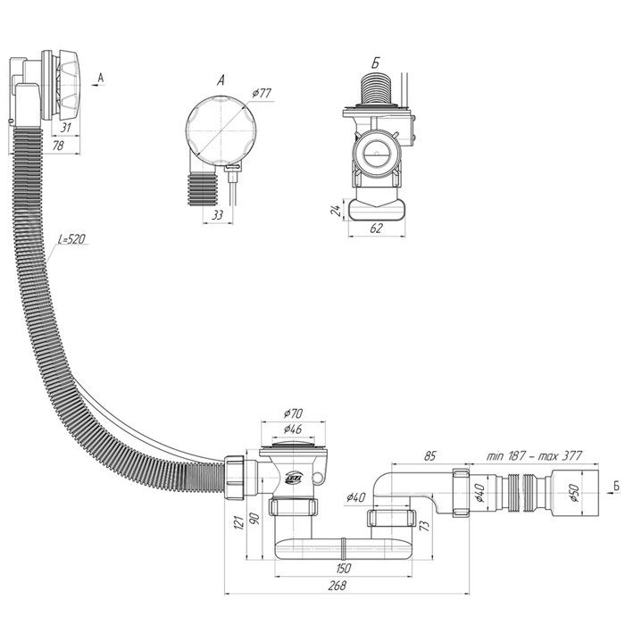 Сифон для ванны Akvater, 1 1/2"х40мм, выпуск и перелив, гофра 40х40/50мм, пробка без цепочки