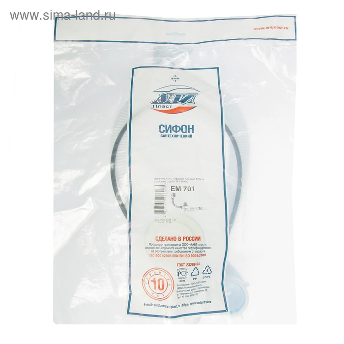 Комплект для ванны "АНИ Пласт" C6055: сифон плоский, гибкая труба 40 х 50 мм