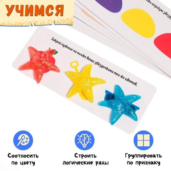 Выполняйте задания с карточек. Например, закройте нужные на пляже вещи звёздочками тех же цветов, продолжите логический ряд, положите в правую ручку синюю морскую звезду, а в левую — красную.