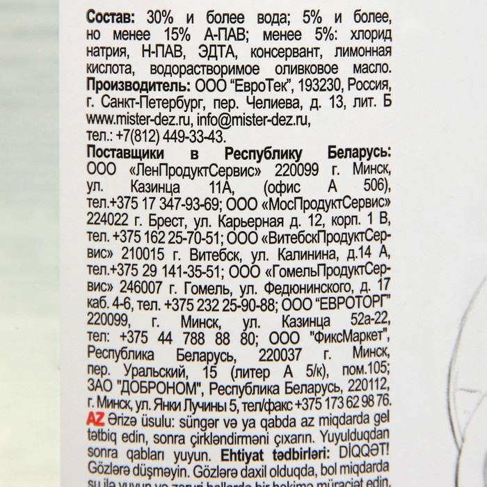 Состав: 30% и более вода; 5% и более, но менее 15% А-ПАВ; менее 5% хлорид натрия, Н-ПАВ, ЭДТА, консервант, лимонная кислота, водорастворимое оливковое масло.