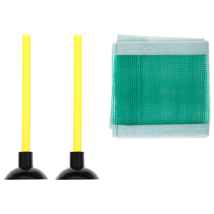 Детский комплект для настольного тенниса включает в себя: 2 ракетки, 3 мячика, сетку, 2 присоски и 2 штатива.