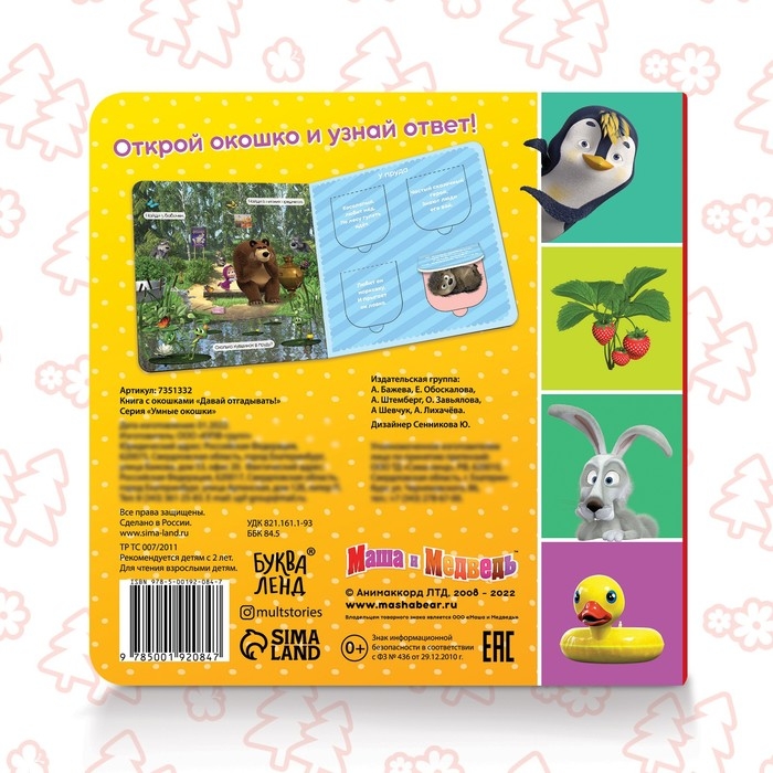 Картонная книга с окошками «Давай отгадывать!», 10 стр., 16 окошек, Маша и Медведь