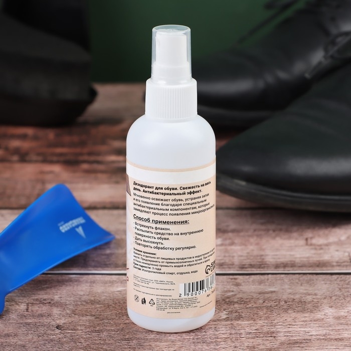 Дезодорант для обуви эффективно устраняет неприятный запах. Обладает дезодорирующими и антисептическими свойствами. Снижает потоотделение. Обеспечивает приятный запах на весь день. Подходит для всех видов обуви.