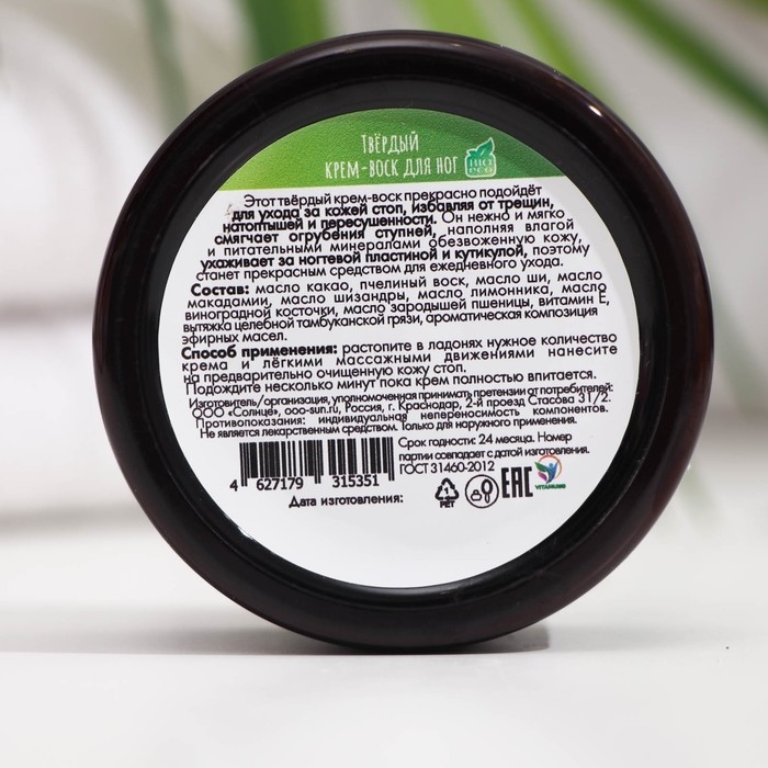 Твёрдый крем-воск для ваших ножек эффективно и бережно ухаживает за ступнями, может смягчить обезвоженную кожу, предотвращая пересушивание, помочь устранить шелушения и огрубения, насытить кожу полезными микроэлементами, заполнить трещинки и неровности, способствуя регенерации и восстановлению, нежно устранить натоптыши и сухость.