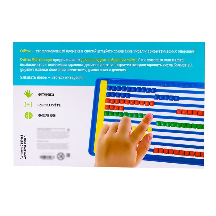Развивающий набор «Счёты Монтессори» предназначен для наглядного обучения сложению и вычитанию. Малыш познакомится с понятием единицы, десятка и сотни, научится визуализировать числа больше 20, укрепит навыки сложения, вычитания и деления.