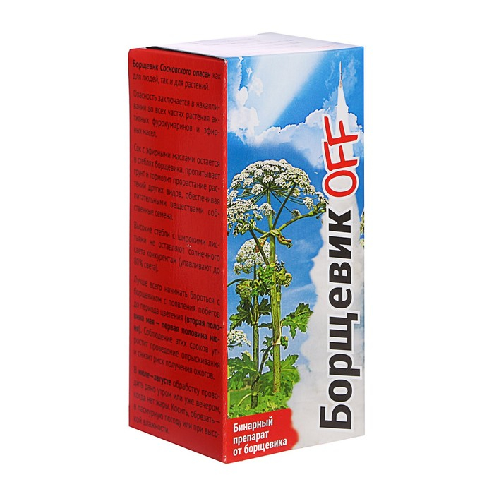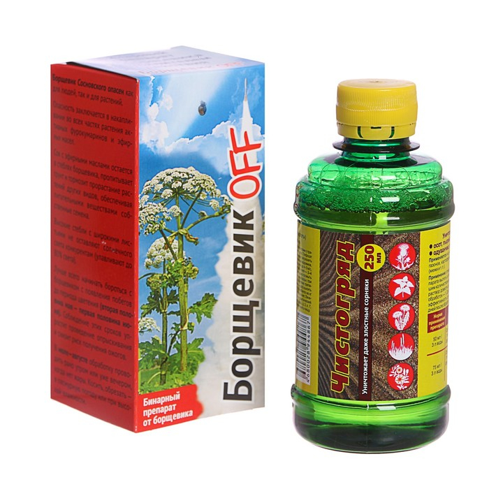 БорщевикOFF — это набор из трех препаратов для самостоятельного применения баковой смеси для усиленного действия против борщевика. Два гербицида (Чистогряд и Линтур) направлены на борьбу со злостным сорняком, Панэм — применяется совместно с гербицидами для повышения их эффективности.