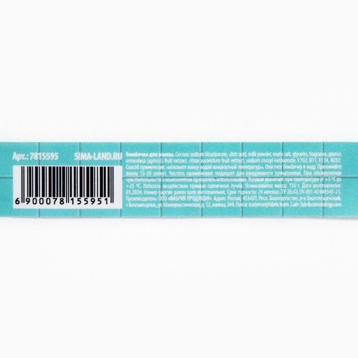 СОСТАВ: (INCI) Sodium Bicarbonate, Citric Acid, Milk Powder, Maris Salt, Glycerin, Fragrance, Prunus Armeniaca (Apricot) Fruit Extract, Citrus Aurantium Fruit Extract, Sodium Cocoyl Isethionate, Е102, В11, Е124, R032.