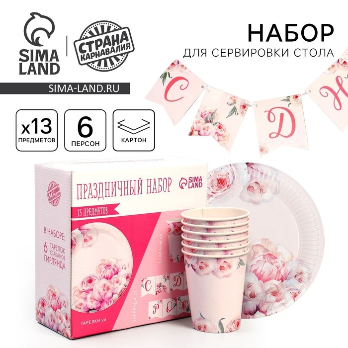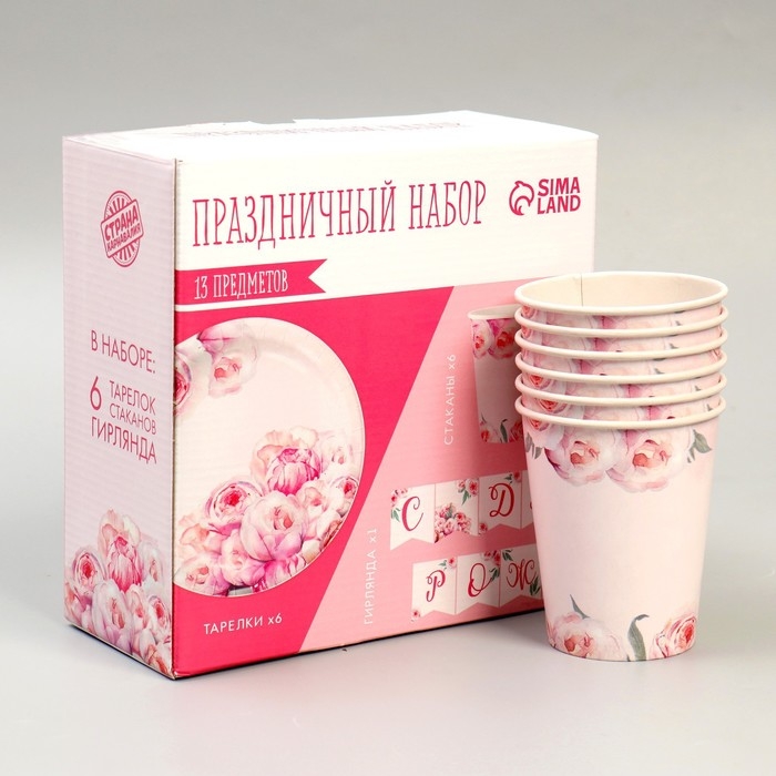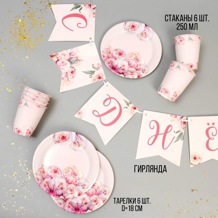Набор бумажной посуды одноразовый Happy Birthday, 6 тарелок , 1 гирлянда , 6 стаканов, 6 колпаков