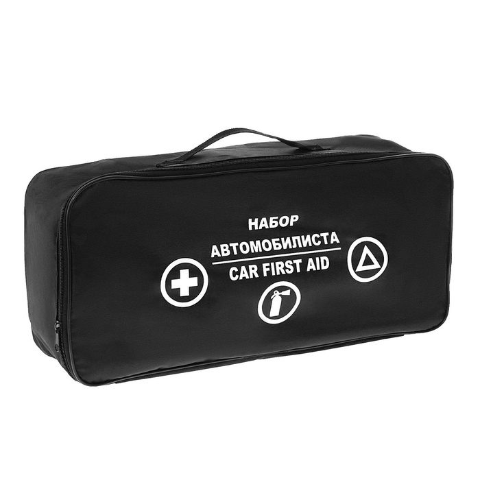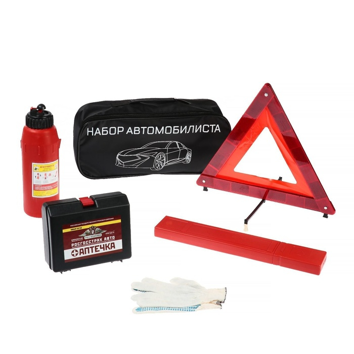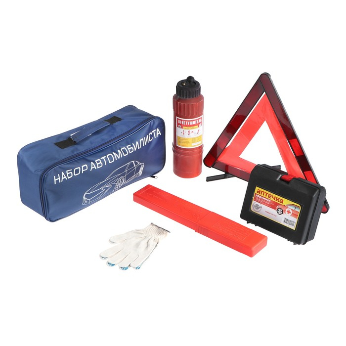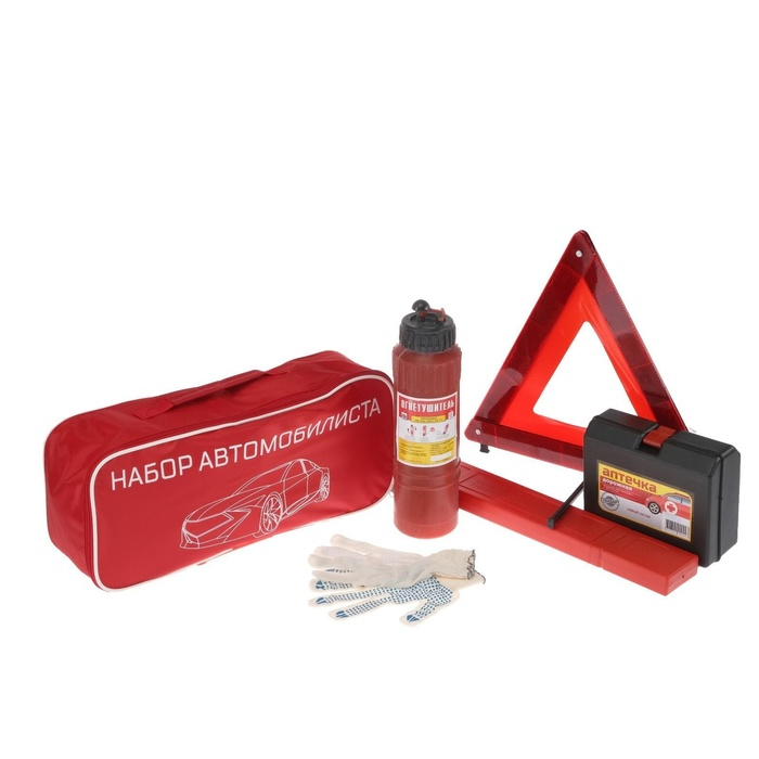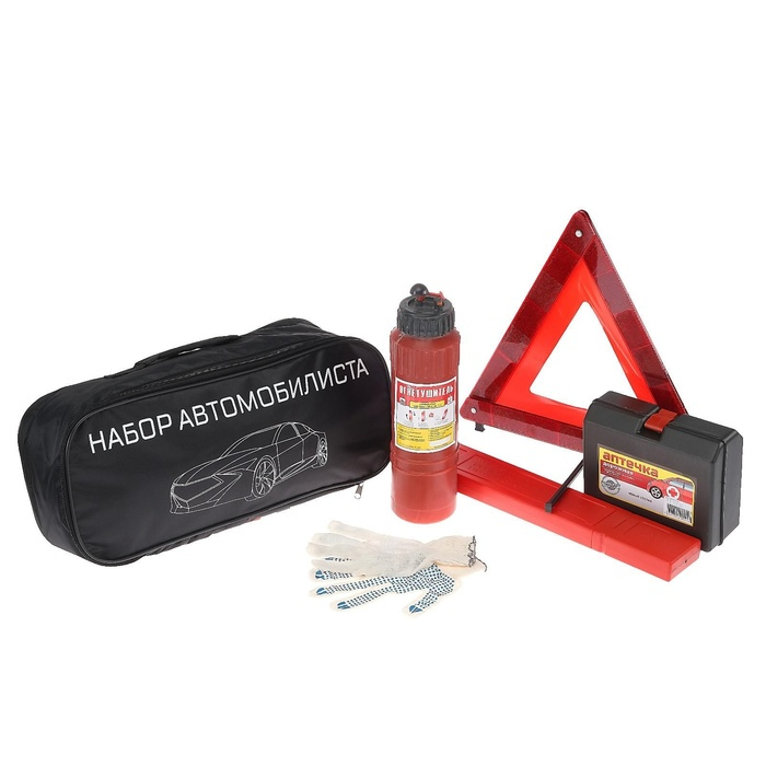 Набор автомобилиста на 5 предметов незаменимый аксессуар в вашем автомобиле, в комплект входят знак аварийной остановки, аптечка, порошковый огнетушитель и перчатки. Все упаковано в компактную и надежную сумку которая не займет много места в багажнике.
