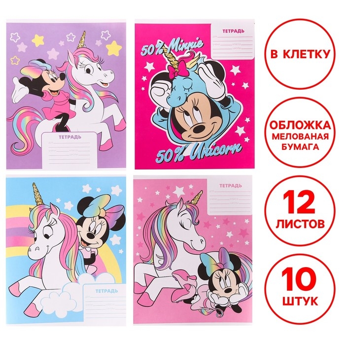 Набор тетрадей 10 штук, 12 листов, в клетку, обложка мелованная бумага, Минни Маус и Единорог