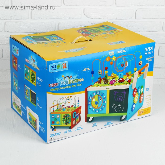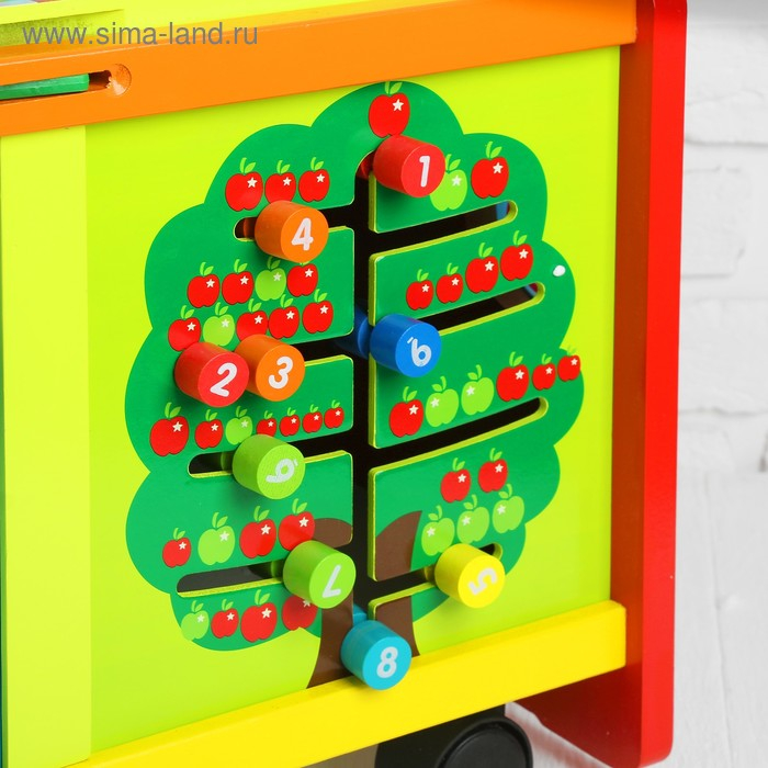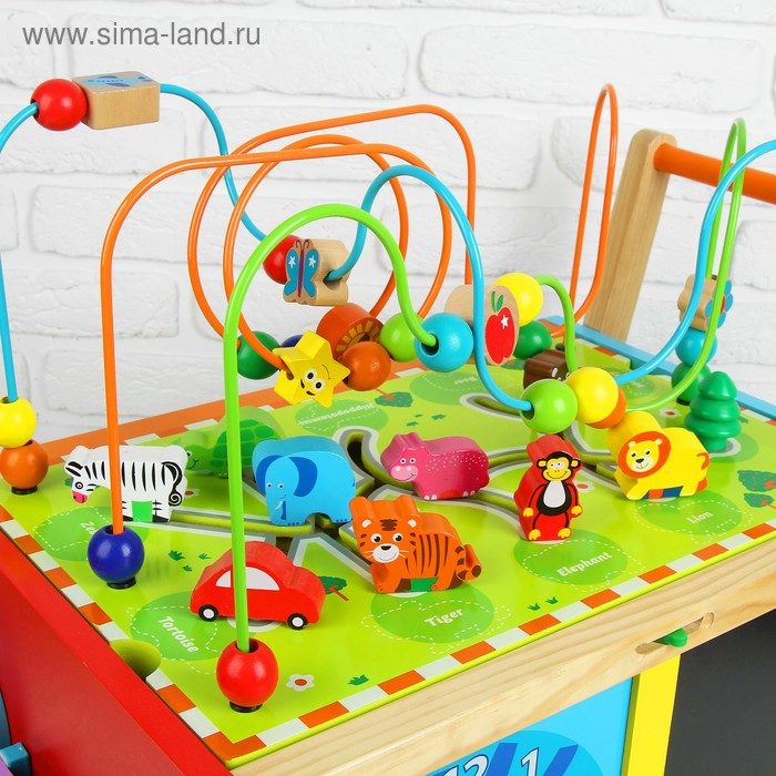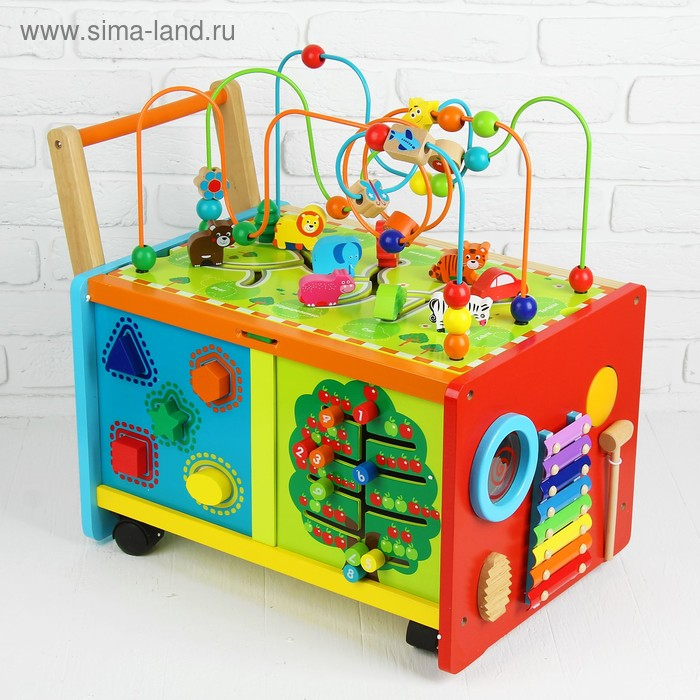 У логического центра множество игровых поверхностей с разными модулями (лабиринт с животными + серпантинка, металлофон, часики, сортер + счётное деревце). Отличительной чертой является формат каталки: благодаря колёсам и ручке кроха сможет перемещать игрушку и сам тренироваться в ходьбе. Логический центр развивает память, моторику пальчиков, логику, расширяет кругозор. Сделан из дерева, окрашен безопасными лаками.