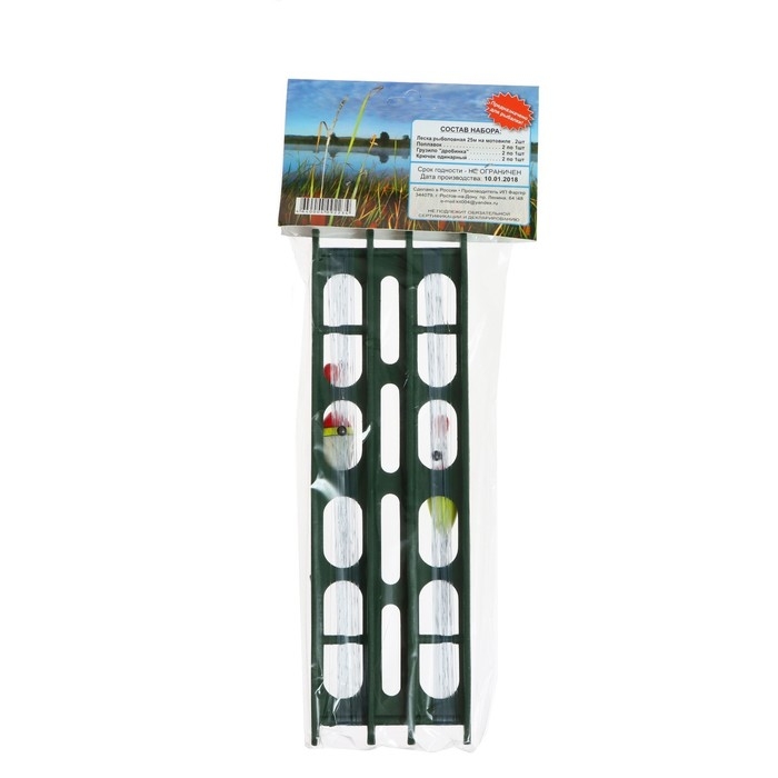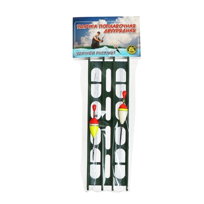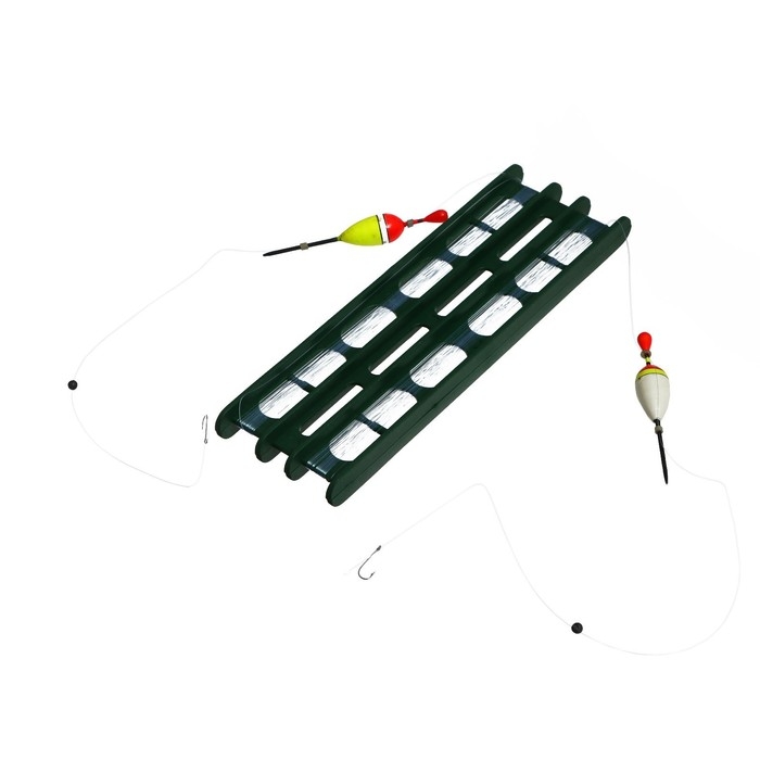 Мотовило двухрядное, леска, два поплавка разного веса, четыре крючка, два вертлюжка, два грузика разного веса.