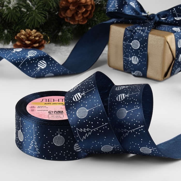 Новый год! Лента атласная «Ёлочные игрушки», 40 мм, 23 ± 1 м, цвет тёмно-синий №038