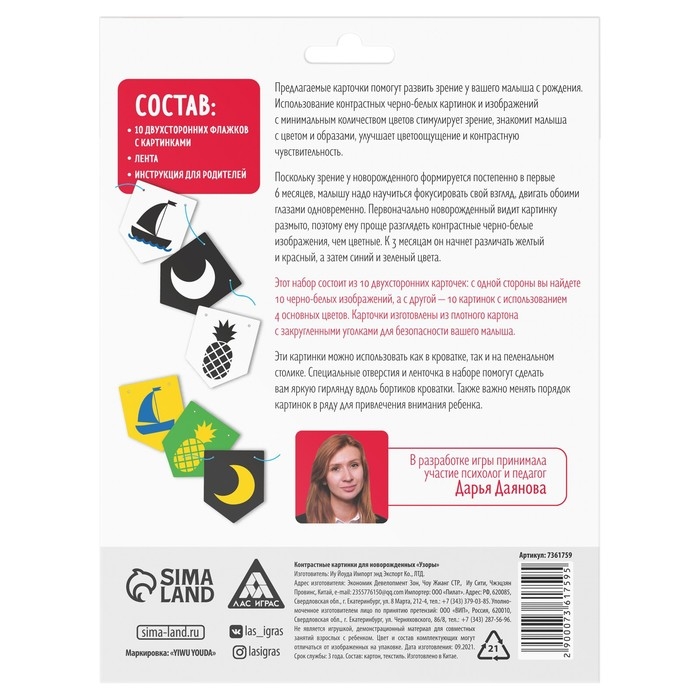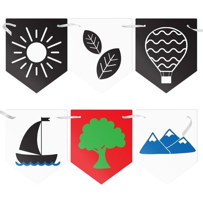 Карточки изготовлены из плотного картона с закруглёнными уголками для безопасности малыша. Эти картинки можно использовать как в кроватке, так и на пеленальном столике. Специальные отверстия на карточках и ленточка в наборе позволяют сделать яркую гирлянду вдоль бортиков кроватки. Также важно периодически менять порядок картинок в ряду для привлечения внимания ребёнка.