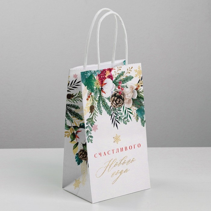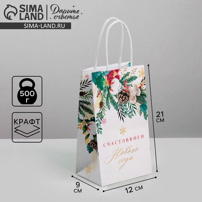 Пакет подарочный новогодний крафтовый «Счастье», 12 х 21 х 9 см, Новый год